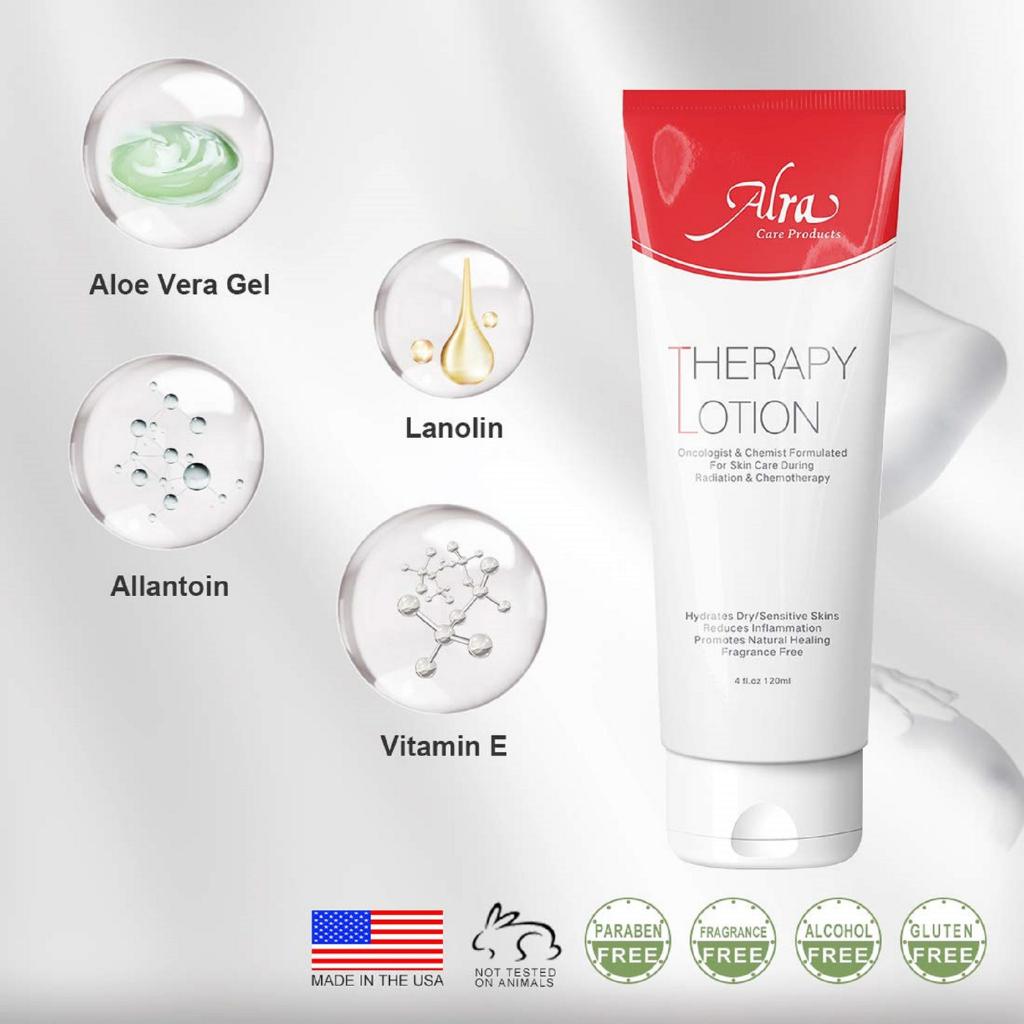 - Alra Therapy Lotion (4oz) – This lotion is therapeutic to skin irritations caused by cancer treatment. It contains aloe vera gel and vitamin E, which nourish your skin and keep it hydrated. Use twice a day or as directed by the physician.