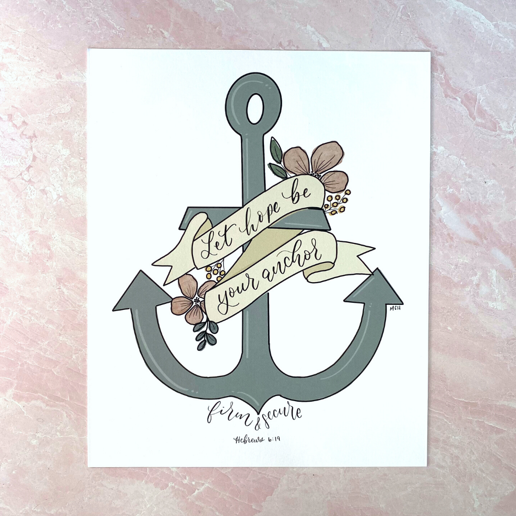 Hebrews 6:19 tells us that Hope is the anchor of the soul. Frame a visual reminder to help you stay firm and secure. Choose from 5 x 7 or 8 x 10 sizes. Artwork by Madeline Harwell of Inspired Inks.