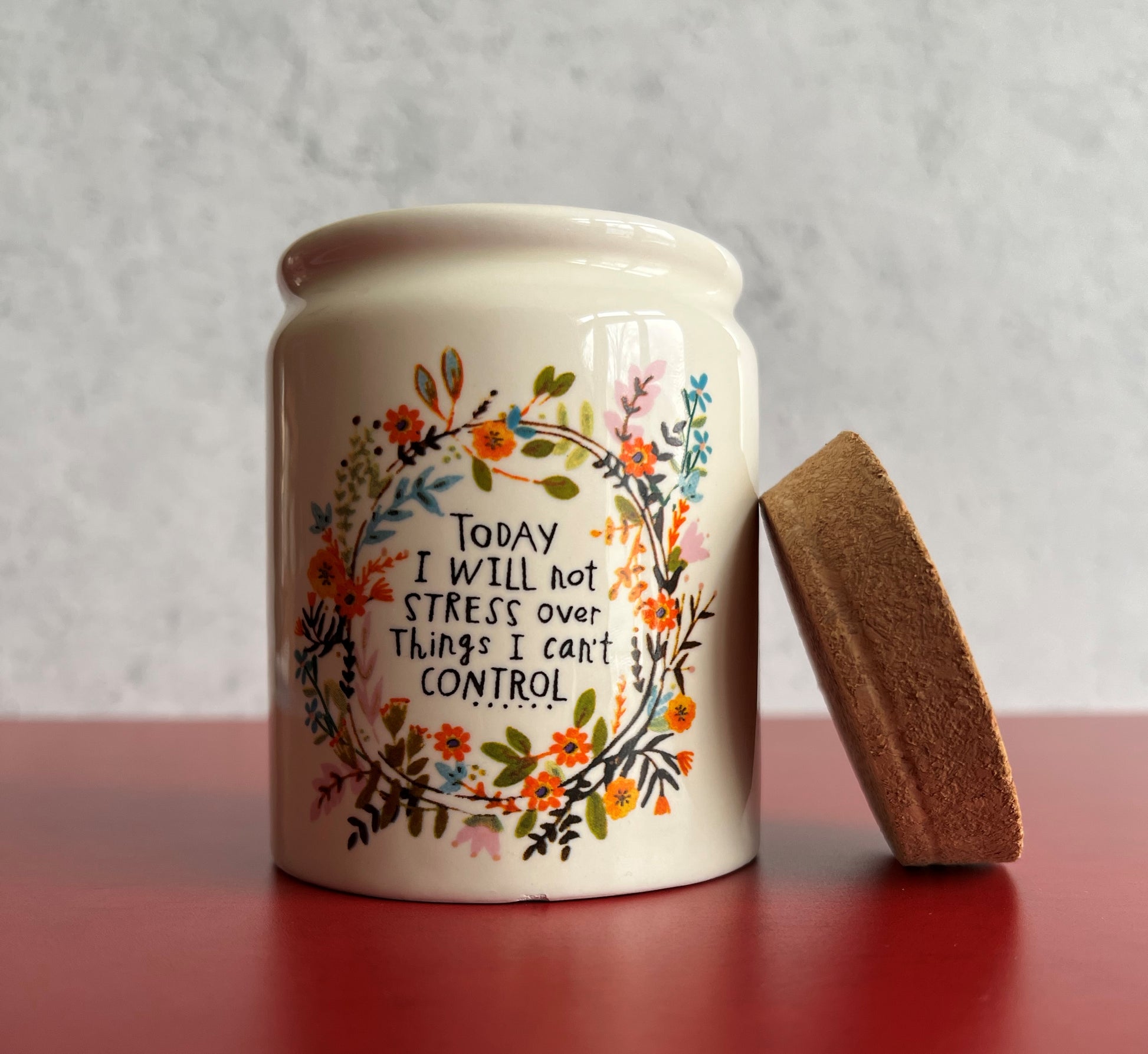 This "Today I will not stress over things I can't control" candle is made from soy wax.