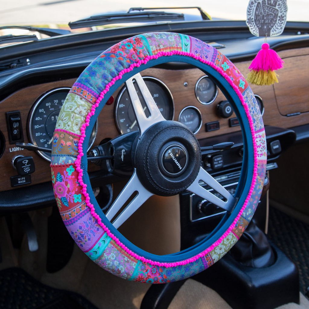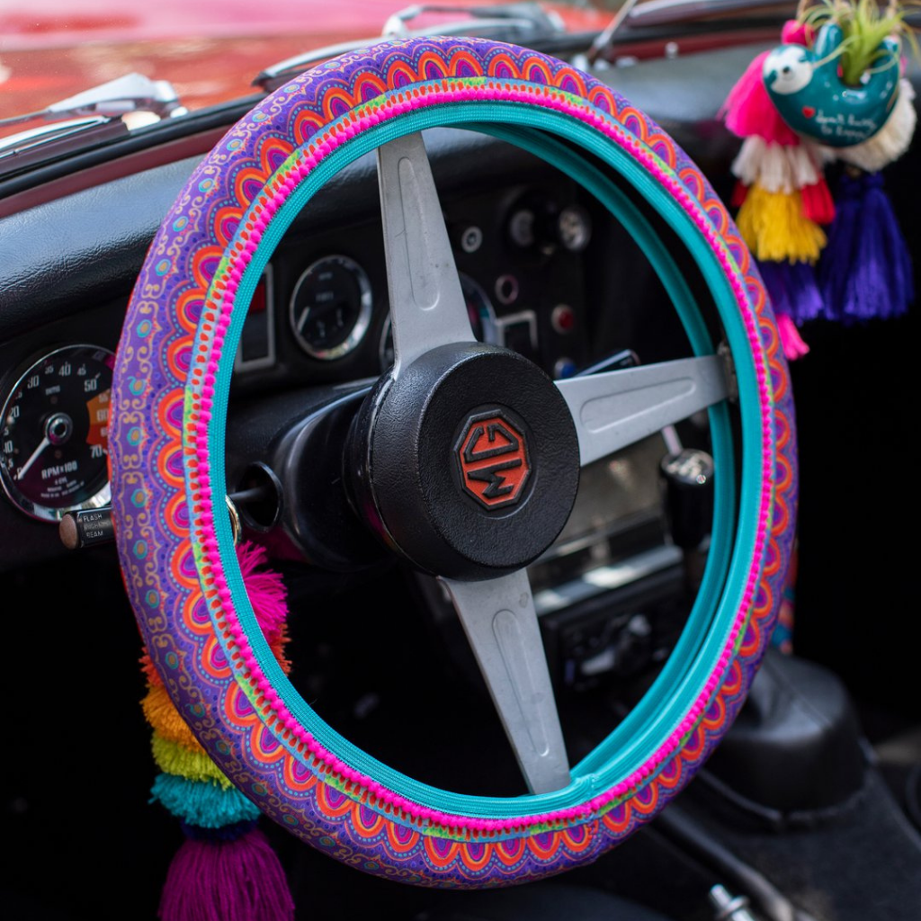 Inspired by a trip to India, this steering wheel cover is nice and tight so it doesn't slip, so use your muscles to get it on!